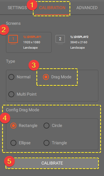 This mode lets you select and calibrate a specific region (rectangle, circle, ellipse, or triangle) directly from the DISPLAX Connect interface.