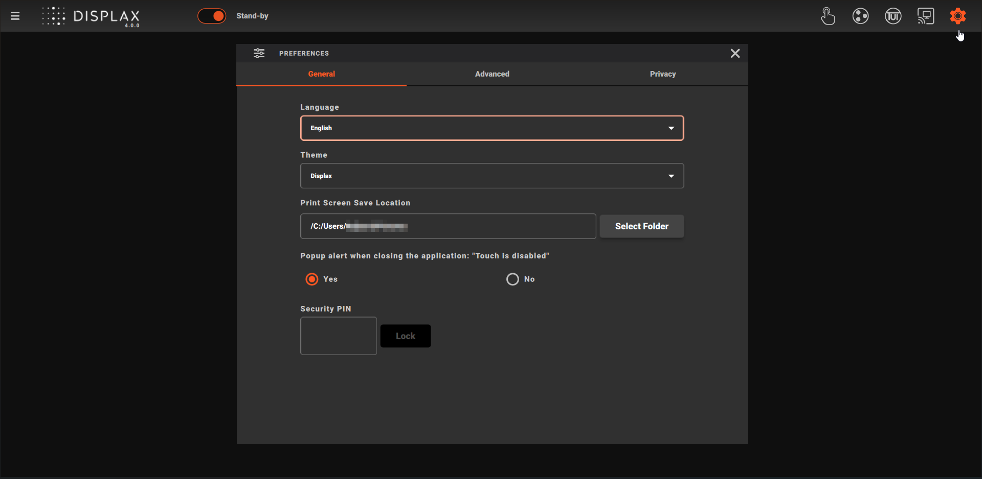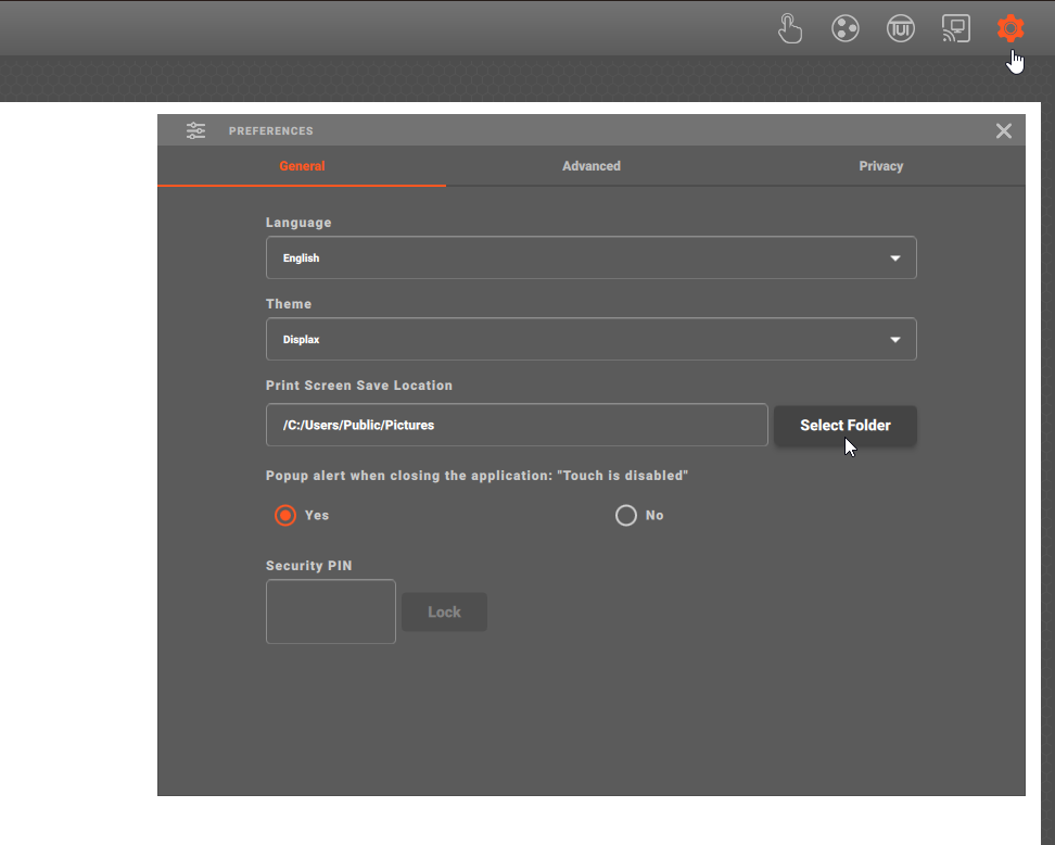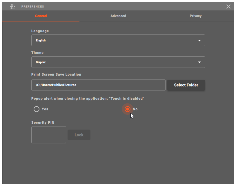 Displax Connect lets you set a Security PIN to protect your configured settings. This ensures only authorized users can change touch controller configurations.
