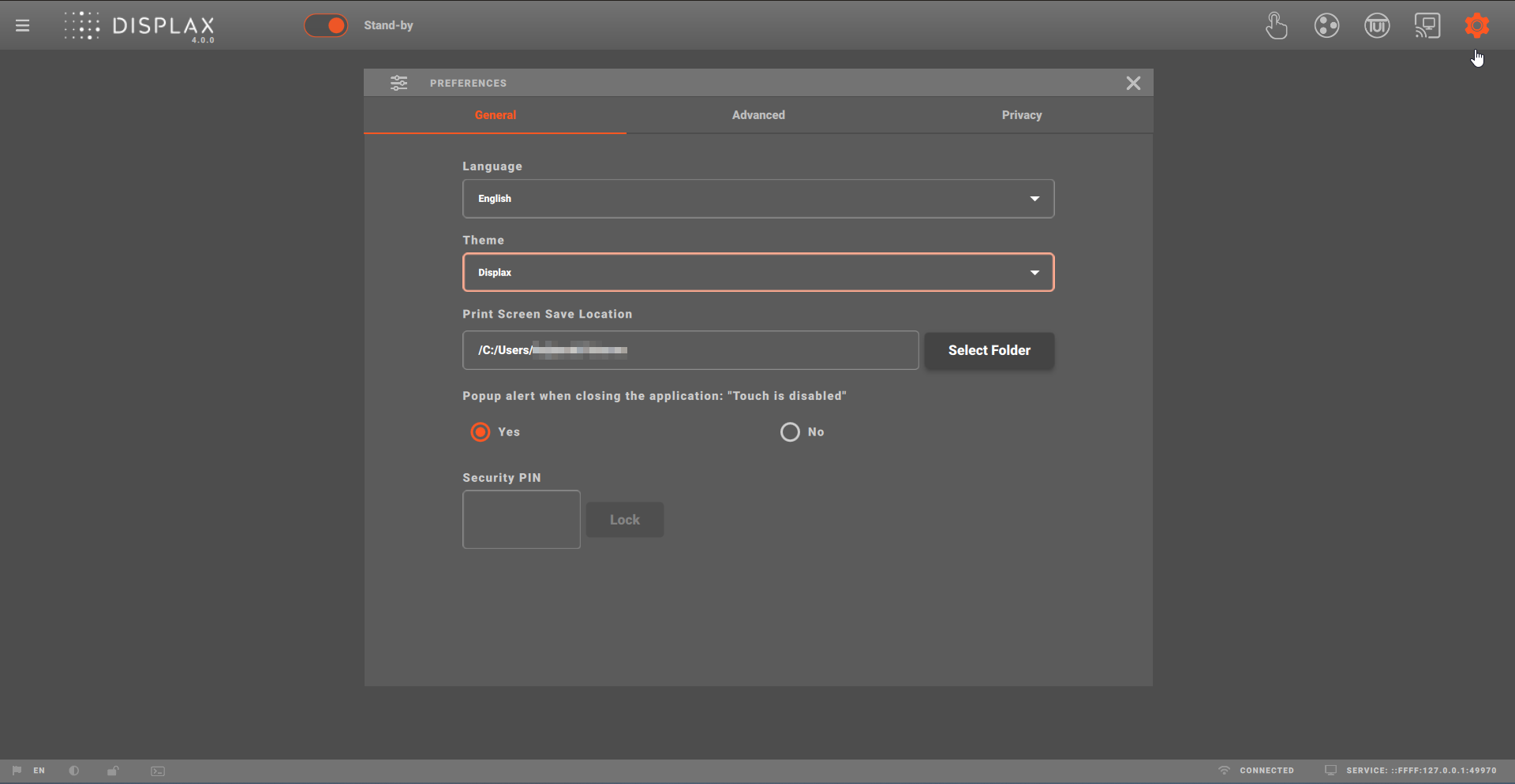 DISPLAX Connect includes a Touch Status Popup designed to prevent accidental shutdowns with touch input disabled.