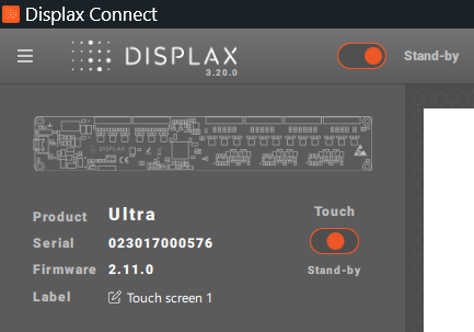 At the top-left corner of the DISPLAX Connect interface, you’ll find essential information about the connected Touch Controller. This section helps identify, manage, and track each controller in your setup.